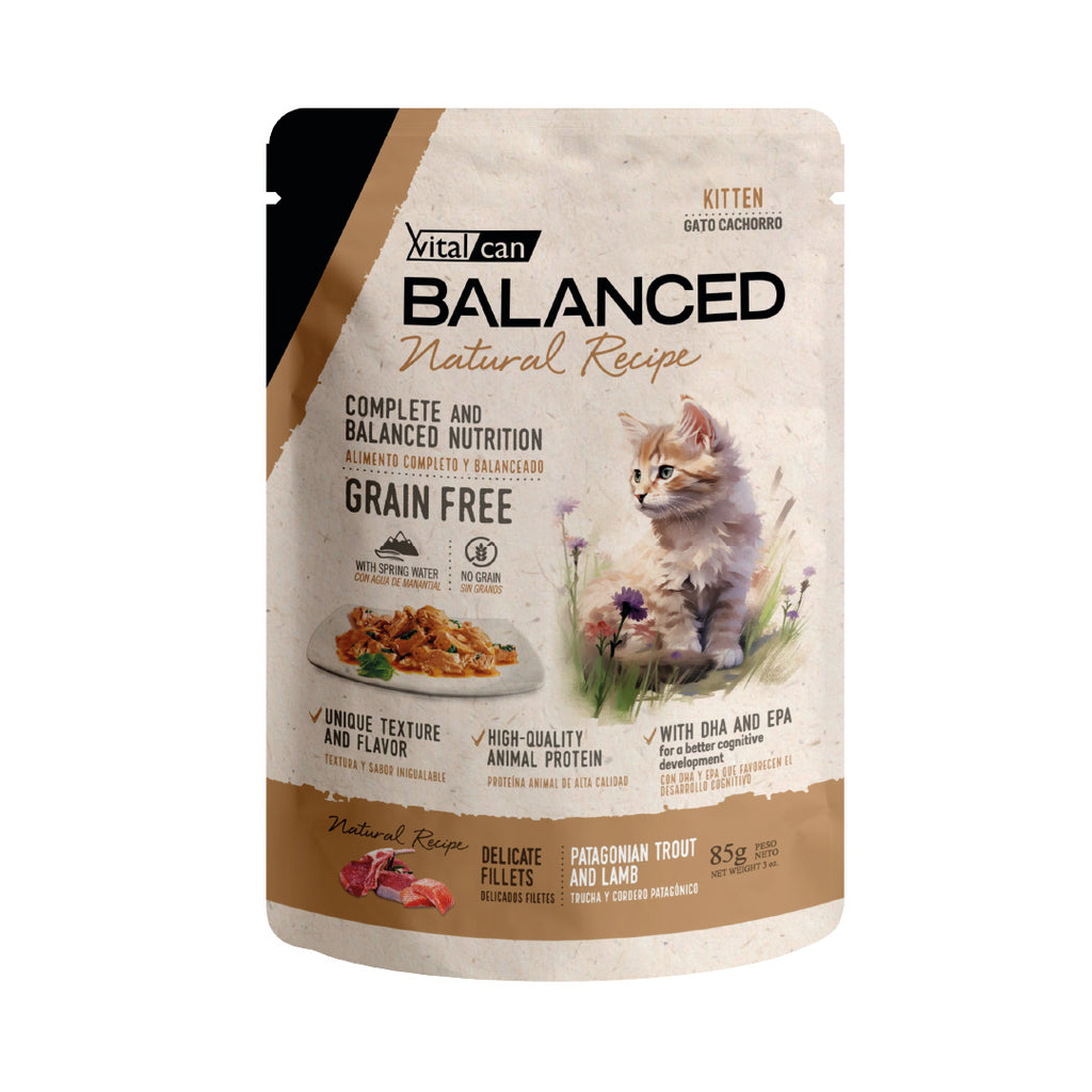 Alimento húmedo en pouch marca Balanced Natural Recipe elaborado con trucha y cordero para Gatitos Cachorros
