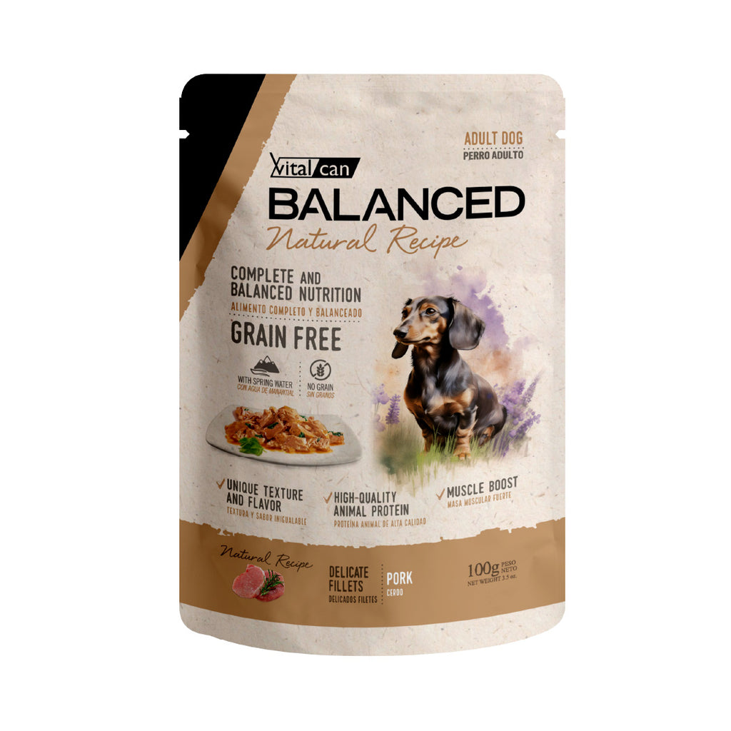 Alimento húmedo en pouch marca Balanced Natural Recipe elaborado con cerdo para Perros Adultos